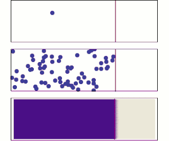 - Middle: With more molecules, there is clearly a trend where the solute fills the container more and more uniformly, but there are also random fluctuations.