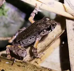 Adult males measure 29–30 mm (1.1–1.2 in) and adult females 31–34 mm (1.2–1.3 in) in snout–vent length. The head is slightly longer than it is wide. The snout is slightly protruding. The tympanum is distinct and rounded; the supratympanic fold is also distinct. The finger and toe tips are rounded and slightly swollen. The fingers have no webbing whereas the toes have rudimentary webbing. Skin is dorsally shagreened. Dorsal coloration is purple-brown, turning to brown-purplish between the eyes and the scapular region. There are various dark-brown to black-brown markings. The elbows and upper arms have distinct dark-orange coloration. The ventral surface of the throat is grey-white; chest and belly are yellowish creamy-white. The iris is bicolored: coppery orange on the upper half and silver grey on the lower half.[1]