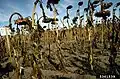 Many symptoms caused by the fungal pathogen can be observed post bloom or after flowering. The main identifying symptom is the production of black lesions along the stem which are usually 2 inches in length and 1 inch in height. Lesions are distinguishable from other similar diseases because they form at the petioles of the stem and are black in color.[3] Lesions can also develop on the leaves, flower bracts, back of the head, and crown or base of stalk. Leaf wilting will also be noticeable. Small, fruiting bodies (pycnidia) are produced on the stem. These structures are spore bearing and can be observed with a magnifying or other hand lens on the lesions themselves.[4] Phoma black stem can be distinguished from other diseases due to its black lesions and lack of lodging. The fungus also produces colonies that are gray-white in color and have a white mycelium that may resemble cotton.[2]