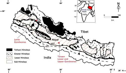 In Nepal, the older LHS with age ranging from the Paleoproterozoic to uppermost Precambrian are separated from the younger LHS by the Great Lesser Himalayan Unconformity.[2] Missing Early Proterozoic strata of the LHS suggest that the rocks may have been eroded before the deposition of the Gondwana strata. Younger continental facies Gondwana strata were first deposited after the unconformity. They are then unconformably overlain by a marine facies Tertiary Unit. The Gondwana strata are mainly developed within two zones in Nepal in the central Himalaya. The first is in central Nepal, where several outcrops of the Tansen Group can be found. The second is in western Nepal, where the Gondwana strata are exposed in the Jumla–Humla basins near the Tethyan Himalaya.[13]