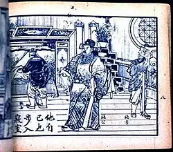 The name in Chinese essentially translates to "linked pictures" or "serial pictures". The books were called "lianhuanhua" or "lianhuan tuhua"; later the "tu" was omitted and the term "lianhuanhua" became standard.[2] The official term lianhuanhua was not used until 1925[3] and was first employed by the Shanghai publishing company Shijie Shuju (World Book Company).[4] Prior to this, lianhuanhua were separated into different name categories depending on the region.[2]