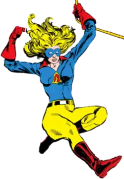 Now a mystery-woman, the Liberty Belle becomes involved in the founding of the All-Star Squadron. On December 8, 1941 she is present, with a handful of other mystery-men, in the White House when President Roosevelt announces his order that the Justice Society of America mobilize all American costumed heroes into a single unit, an All-Star Squadron, responsible directly to the President. Their first mission is to fly to the West Coast, search out any saboteurs and prevent a Japanese attack on the U.S. mainland.[9] They find the JSA have been captured by the time travelling villain Per Degaton, who is planning to change the events in an attempt at world domination. They stopped this, though when Per Degaton went back to 1947, they forgot his involvement. Soon after, the core members of the All-Star Squadron, including Libby, begin the process of electing other mystery-men for membership. During the meeting, the matter of electing a permanent chairman is decided by secret ballot, and the Liberty Belle receives the majority vote.[10]