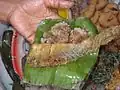 Nga baung thoke ငါးပေါင်းသုပ် Mon Mixed vegetables and prawn, wrapped in morinda leaves and banana leaves outside.