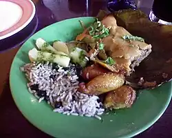 • Hallaca – rectangle-shaped meal made of maize, filled with beef, pork, chicken, olives, raisins and caper, and wrapped in plantain leaves and boiled to cook.
