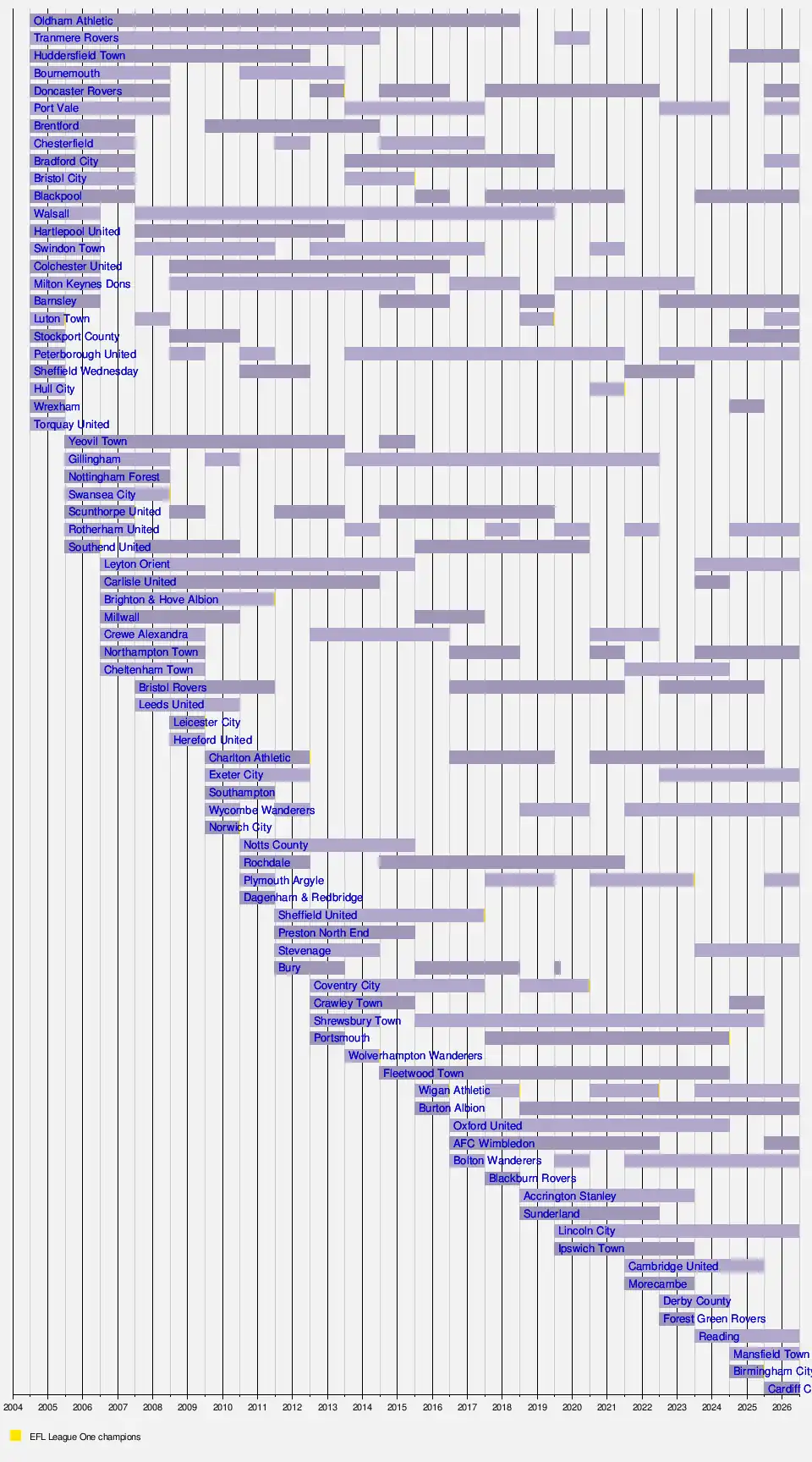 EFL League One teams playing in the 2025–26 season are indicated in bold. If the longest spell is the current spell, this is indicated in bold, and if the highest finish is that of the most recent season, this is also in bold. Teams in italic no longer exist in the legal form they competed as in League One. A total of 79 teams have played in League One.