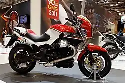 - Griso 1100 (1,064 cc) (since 2005): Italianised version of the Lombard word for "gray one", named after a gray-bearded character in the famous Italian literature saga The Betrothed—a riding posture between sport and standard; first saw light as a prototype at EICMA 2003 in Milan, when Moto Guzzi was still owned by Aprilia. After Piaggio absorbed Moto Guzzi, they proceeded (in house) to quickly develop the Griso for production, adapting Guzzi's historic V-twin engine to the new bike. In keeping with the bike's hard-edged, techno-custom styling, an oversized oil radiator graces the right side of the engine, in plain view.[4]
