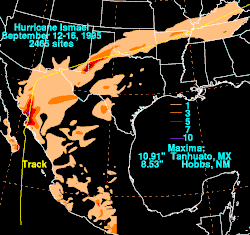 - September 15, 1995 – The remnants of Hurricane Ismael dropped 8.53 in (217 mm) of rainfall in Hobbs,[21] with unofficial reports of over 10 in (250 mm). The intense precipitation flooded many houses and closed several roads. Flooding also washed out three sections of the Texas – New Mexico Railroad line. Damage was estimated at $250,000 (1995 USD).[39]