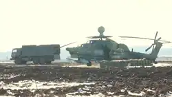 Mil Mi-28 attack helicopter at a forward deployment point.