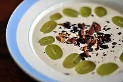 Ajoblanco is a popular andalusian cold soup made of bread, crushed almonds, garlic, water, olive oil, salt and sometimes vinegar.