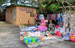 List of beaches of South Africa, A beach is a geological landform along the shoreline of a body of water. It usually consists of loose particles which are often composed of rock, such as sand, gravel, shingle, pebbles, or cobblestones. The particles of which the beach is composed can sometimes instead have biological origins, such as shell fragments or coralline algae fragments.
