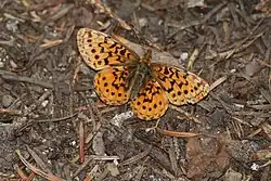 This is a list of species of butterfly with the common name fritillary. The term fritillary refers to the chequered markings on the wings, usually black on orange, and derives from the Latin fritillus, meaning "dice-box" (or, according to some sources, a "chequerboard"); the fritillary flower, with its chequered markings, has the same derivation.[1] Most butterfly fritillaries belong to the family of Nymphalidae, within which are several genera whose species are nearly all called fritillaries: Argynnis, Boloria, Speyeria (the greater fritillaries), Euphydryas, Melitaea, and Agraulis.