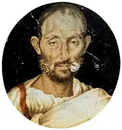 Several details indicate the Egyptian, perhaps Alexandrian origin of the medallion. Both words of the inscription (ΒΟΥΝΝΕΡΙ ΚΕΡΑΜΙ) end in iota, possibly indicating the Ancient Greek dialect of Egypt; ΚΕΡΑΜΙ, then, means "potter".[3] Stylistically, the painting is closely related to the 3rd-century mummy portraits found in the Faiyum Oasis.[3] The costumes are more consistent with the contemporary fashions in Egypt than in Rome itself. In particular, the mantle worn by the middle figure is not fastened by a fibula, but instead knotted; one parallel for this is a 3rd-century Coptic tapestry medallion, now in the Hermitage Museum, showing the goddess Gaea with her mantle knotted in a similar way.[33] The peculiar hair style of the older woman is unknown in Roman portraiture, but can be found on some 3rd-century plaster mummy masks from Egypt.[33][34]