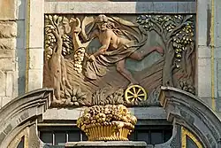 House of the Corporation of Greasers | Former property of the Corporation of Greasers since the 15th century, built in stone in 1644. The façade partly resisted the bombardment of 1695 and was rebuilt in 1696–97 probably by Jan Cosijn. Decorated with a statue of Saint Giles (patron saint of greasers), it was restored in 1894–1913. The left door opened into a now disappeared alleyway that led onto the Rue au Beurre.[9] |