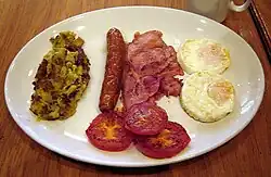 Germany | A breakfast dish made from fried potatoes, eggs, onions, leeks or chives, and bacon or ham. It is similar to the somewhat simpler English bubble and squeak. |