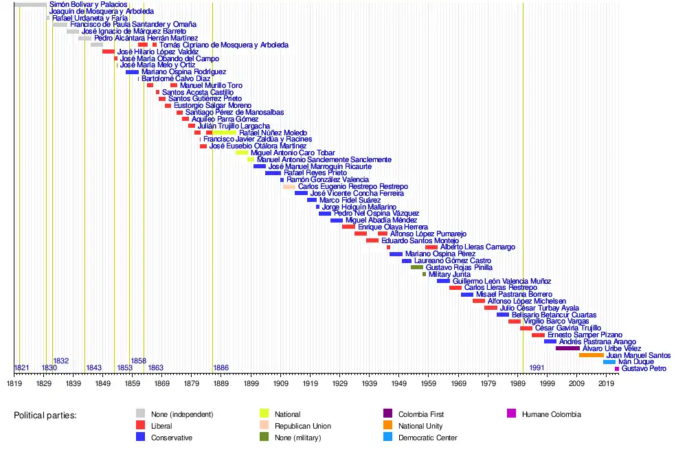 Gustavo PetroIván DuqueJuan Manuel SantosÁlvaro Uribe VélezAndrés Pastrana ArangoErnesto Samper PizanoCésar Gaviria TrujilloVirgilio Barco VargasBelisario Betancur CuartasJulio César Turbay AyalaAlfonso López MichelsenMisael Pastrana BorreroCarlos Lleras RestrepoGuillermo León Valencia MuñozMilitary JuntaGustavo Rojas PinillaLaureano Gómez CastroMariano Ospina PérezAlberto Lleras CamargoEduardo Santos MontejoAlfonso López PumarejoEnrique Olaya HerreraMiguel Abadía MéndezPedro Nel Ospina VázquezJorge Holguín MallarinoMarco Fidel SuárezJosé Vicente Concha FerreiraCarlos Eugenio Restrepo RestrepoRamón González ValenciaRafael Reyes PrietoJosé Manuel Marroquín RicaurteManuel Antonio Sanclemente SanclementeMiguel Antonio Caro TobarJosé Eusebio Otálora MartínezFrancisco Javier Zaldúa y RacinesRafael Núñez MoledoJulián Trujillo LargachaAquileo Parra GómezSantiago Pérez de ManosalbasEustorgio Salgar MorenoSantos Gutiérrez PrietoSantos Acosta CastilloManuel Murillo ToroBartolomé Calvo DíazMariano Ospina RodríguezJosé María Melo y OrtizJosé María Obando del CampoJosé Hilario López ValdézTomás Cipriano de Mosquera y ArboledaPedro Alcántara Herrán MartínezJosé Ignacio de Márquez BarretoFrancisco de Paula Santander y OmañaRafael Urdaneta y FaríaJoaquín de Mosquera y ArboledaSimón Bolívar y PalaciosColombian Constitution of 1991Colombian Constitution of 1886