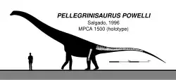 - Salgado, L. (1996). "Pellegrinisaurus powelli nov. gen. et sp. (Sauropoda, Titanosauridae) from the Upper Cretaceous of Lago Pellegrini, Northwestern Patagonia, Argentina". Ameghiniana. 33 (4): 355–365. ISSN 1851-8044.