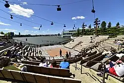 There is also a 687-seat amphitheater nicknamed "The Amph",[7][8] which is in the western end of Little Island.[1] The Amph is on the north side of the park's tallest hill, where there is a flat pier with public restrooms and actors' changing rooms. The utilities had to be placed on top of the flat pier.[10] At the park's opening in 2021, most events at the Amph were free but, for ticketed shows, thirty percent of tickets were to be sold online.[2] The ticketed shows are largely free or have low admission fees, and educational programming and performances are scheduled for six days a week.[8] The free or low admission fees were a term of Diller's lease agreement from the Hudson River Park Trust, which operates Hudson River Park. Under the terms of the agreement, at least 51 percent of tickets must be under 30 dollars, including tickets provided for free.[6]