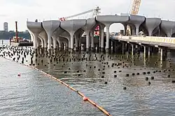 Cuomo provided $50 million for the park in April 2018, but with the condition that the city raise a matching amount.[55] Construction of the structure began the same month, with the construction of walkways from the Hudson River Park esplanade to the future park site.[56][57] The new estimate for the project was $250 million.[58] By that August, the pilings were being installed.[59] A symbolic cornerstone was laid in December 2018.[9] At this time, the first of the park's pots was delivered from upstate New York and installed at Pier 55. The park itself was planned to be significantly completed in 2020 and open to the public in early 2021.[9][11] The pots were manufactured and delivered by the Fort Miller Company starting in 2018. The pilings upon which the pots were to be installed, could only be driven from May to November of each year. As a result, 164 piles were driven in 2018 and the remaining 103 piles were driven from May to July 2019. The subsequent construction of the landscape, concession, and programming areas required coordination between the different contractors due to limited space for staging areas. Several cranes were used, including one on a barge, and materials were delivered by barge.[10]