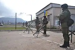 Between February and March 2014, these unmarked Russian soldiers occupied and blockaded the Simferopol International Airport,[2] most of Ukraine's Crimean military bases,[3] and the Supreme Council of Crimea. The name has also sometimes been used to refer to Russian troops during the War in Donbas; the Kremlin stated that no Russian troops were active in the region, but many little green men were operating in this region while disguised as pro-Russian separatists.[4][5]