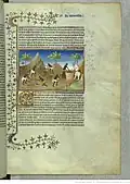 Folio 45r, or The Khan's Money Exchange, shows a scene of trade between a seated khan and three men. The text on the same page, from Marco Polo's Description of the World, describes the novelty of the khan's paper money, noting that traders from far-off locales bring their wares in exchange for these slips of paper. The three men in the image serve as an example of this widespread interest, their hats and clothing suggesting they belong to different cultures. The inspiration for these figure's clothing could have originated from artistic contact between Europe and Asia but most likely originated from Italian art depictions of "Eastern" figures.[3] In either case, this folio serves as record of cross-continental trade.