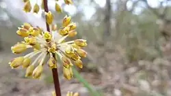 They are a diecious plant, meaning the male and female flowers are carried on separate plants, which is a distinct feature of the plant.[5] During spring, the flowers show a creamy yellow colour which are arranged in clusters around the base of the leaves.[5] The flowers have 6 petals, the inner petals are usually yellow and the outer petals reddish brown. The flowers grow in dense clusters on branch or unbranched spikes often 25–75 cm with spiky white bracts.[1] The male stalked and bell-shaped flowers are smaller than the female stalkless flowers. The male flowers grow on a branched stem whereas the female occur on unbranched.[1][9]