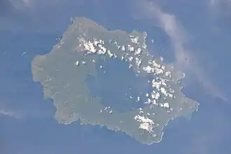 Two stratovolcanoes are located on the island: Mount Reaumur and Cerisy Peak. The summit of the volcanic complex collapsed during at least three major explosive eruptions, about 16,000, 4000, and 300 years ago. These produced a large caldera 10 km × 12.5 km (6.2 mi × 7.8 mi) in size, now filled with a freshwater crater lake, Lake Wisdom. In 1953-1954 and 1968, volcanic activity created Motmot Island on the crater lake,[2] 200 m × 200 m (650 ft × 650 ft) in size. The 1660 eruption was one of the largest in Papua New Guinea's recent history with an estimated air-fall volume in excess of 11 km3 (2.6 cu mi),[3] comparable to the 1991 eruption of Mount Pinatubo, but the Global Volcanism Program gives a much higher estimate of 30 km3 (7.2 cu mi). This cataclysmic event prompted legends of a "Time of Darkness".[4] The most recent (and a smaller) eruption occurred in 1993.