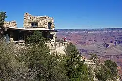 Lookout Studio, known also as The Lookout, is a stone building located on the South Rim of the Grand Canyon, within Grand Canyon National Park in Arizona. It is part of the Grand Canyon Village Historic District, and is part of the Mary Jane Colter Buildings National Historic Landmark. It currently operates as a gift shop and observation station for visitors, with telescopes on its outdoor terrace. Lookout Studio was constructed by the Santa Fe Railway in 1914 and was established as a photography studio to compete with Kolb Studio. It is one of six buildings at the Grand Canyon that were designed by architect Mary Colter, along with Bright Angel Lodge, Hermit's Rest, Hopi House, Phantom Ranch, and Desert View Watchtower. Lookout Studio employs her signature rustic style of using jagged native rocks to imitate indigenous structures of the region and to blend in with the environment.[3]