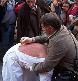 The partner and the práctico (person in charge of healing the wounds) decide when to stop hitting, to start spotting small bruises. There is no set time, but is usually between ten and twenty minutes leading up to 1,000 hits. The handy "práctico" will cut three times on both sides of the lumbar back, using a tool called "esponja", which is a ball of beeswax with six crystals embedded in two in two, so it will receive twelve punctures symbolizing the number of apostles. After that the disciplinante hitself a few times, for that the blood that may have accumulated in the area, can escape and prevent further problems.
