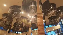 The Oregonian's Michael Russell said Lucier was housed in a "prow-like building" with cantilevered windows and views of the Willamette River.[7] The 7,600-square-foot (710 m2)[8] interior had "one-of-a-kind features", including "a marble wall milled with abstract swimming designs", a "shimmering" canal that was also described as a lazy river and water channel[2][9] lined with iridescent gold tiles, and "oversized chandeliers made from bronze tubes of varying heights".[10] According to Christina Melander of The Oregonian, Lucier had African hardwoods, custom-leather furniture made in Italy, and a "brigade-style" kitchen.[11] The restaurant had silver front doors, twenty glass sculptures by Dale Chihuly, leather-padded bathroom walls, and a bar "capped by a gold dome designed to resemble the sun".[7]