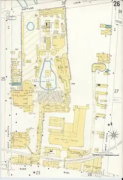 Thompson and Dundy agreed to take over the site of Paul Boyton's 16-acre (6.5 ha) Sea Lion Park in August 1902.[12][13] As part of the deal, they leased some land from Frederick Kister, and they also leased a strip of land on West 12th Street for 25 years.[14] Sea Lion Park had several centerpiece rides, but low attendance during the 1902 season and competition with Steeplechase Park had prompted Boyton to leave the amusement park business.[9] Thompson and Dundy also leased the adjacent site of the Elephantine Colossus Hotel,[9] which had burned down in 1896.[15] This gave them 22 acres (8.9 ha), all the land north of Surf Avenue and south of Neptune Avenue, between West 8th and West 12th Streets.[16]