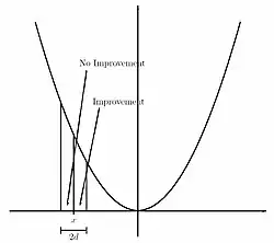 When the current position x is far from the optimum the probability is 1/2 for finding an improvement through uniform random sampling.