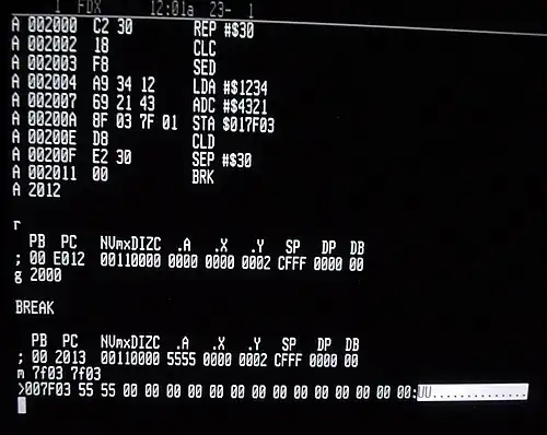 Machine code monitor in a W65C816S single-board computer, displaying code disassembly, as well as processor register and memory dumps