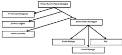 Evans uses the Pama–Nyungan offshoot model from the article written by Geoffrey O'Grady, Preliminaries to a proto Nuclear Pama-Nyungan stem list[10] to propose that Pama–Nyungan is an offshoot language family sharing immediate ancestry with these three non-Pama-Nyungan subgroups.[6] Evans identifies the Garrwan language as a close sister of the Pama–Nyungan languages, due to the morphological and phonological elements found in the Garrwan language that link Pama–Nyungan languages to the stages when the Proto-Pama–Nyungan languages split from its predecessors.[6] Evans also refers to O'Grady's grouping of the Gunwinyguan and Tangkic languages with the Pama–Nyungan language group as 'nuclear Pama–Nyungan',[10] in order to make the higher-level Macro-Pama-Nyungan language family classification.[6]
