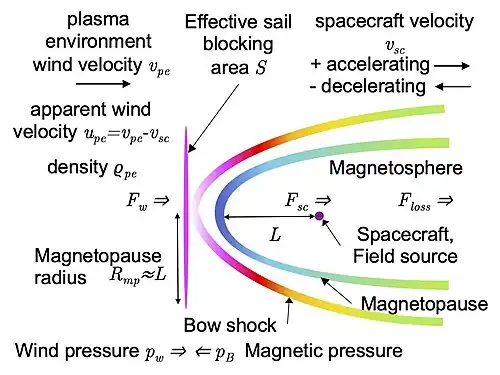 The figure depicts the MHD model as described in Funaki[1] and Djojodihardjo.[2] Starting from the left a plasma wind in a plasma environment (e.g., stellar, ISM or an ionosphere) of effective velocity with density encounters a spacecraft with time-varying velocity that is positive if accelerating and negative if decelerating. The apparent plasma wind velocity from the spacecraft's viewpoint is . The spacecraft and field source generate a magnetic field that creates a magnetospheric bubble extending out to a magnetopause preceded by a bow shock that deflects electrons and ions from the plasma wind. At the magnetopause the field source magnetic pressure equals the kinetic pressure of the plasma wind at a standoff shown at the bottom of the figure. The characteristic length is that of a circular sail of effective blocking area where is the effective magnetopause radius. Under certain conditions the plasma wind pushing on the artificial magnetosphere bow shock and magnetopause creates a force on the magnetic field source that is physically attached to the spacecraft so that at least part of the force causes a force on the spacecraft, accelerating it when sailing downwind or decelerating when sailing into a headwind. Under certain conditions and in some designs, some of the plasma wind force may be lost as indicated by on the right side.