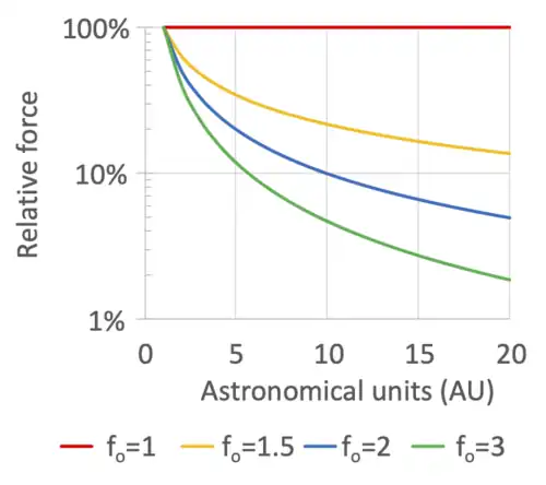 using equation MFM.3 for and equation MHD.2 for . This is the same expression as equation (10b) when and [2] and[7]: Eq (108)  and the right hand side from equation (20) specifically applied to M2P2[31] with other numerical coefficients grouped into the term. Note that force increases as falloff rate decreases. For the solar wind case, substituting MHD.2 into MFM.5 and using the function for the solar wind plasma mass density ,[28]: Fig 5  with the distance from the sun in Astronomical units (AU) results in the following expression: