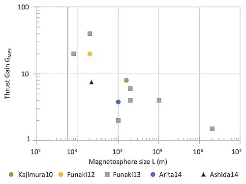 58. ^ a b c d Arita, H.; Nishida, H.; Funaki, I. (2014). "Magnetohydrodynamic Analysis of Thrust Characteristics on Magneto-Plasma Sail with Plasma Magnetic Field Inflation by Low-Beta Plasma". Trans. JSASS Aerospace Tech. Japan. 12 (ists29): 39–44. Bibcode:2014JSAST..12.Pb39A. doi:10.2322/tastj.12.Pb_39 – via stage.jst.go.jp.