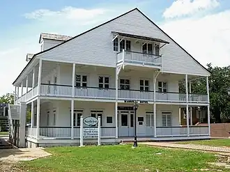 The Magnolia Hotel was constructed for John Hahn, who operated a coffeehouse in New Orleans.[5] Originally, the hotel was a 2+12-story, wood-frame building with plastered exterior walls that measured 54 feet (16 m) on each side. The exterior walls were recessed 7 feet (2.1 m). A central hall extended front to back on both floors. The first floor had paired rooms on either side of the hall; the second floor hall had six rooms on either side. The hotel was originally located near the beach, facing south, toward the Mississippi Sound.[6]