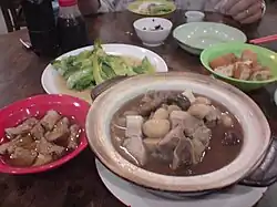 - Bak kut teh (Chinese: 肉骨茶) (pork ribs soup). "Bak kut teh" in Hokkien dialect means "meat bone tea",[1] and the dish is pork ribs cooked with garlic, dark soy sauce and a specific combination of herbs and spices which have been boiled for many hours. Popularly regarded as a health tonic, this soup is believed to have originated in Klang, and eaten accompanied by strong tea ("teh").[2] There are some differences in seasoning amongst other Chinese communities; the Teochew prefer a clear broth with more pepper and garlic (more common in Johor and Singapore),[3] while the Cantonese may include additional varieties of medicinal herbs and spices.[4] Variations include the so-called chik kut teh (made with chicken) and other non-pork versions with beef or mutton that are gaining popularity with Muslim diners,[4] seafood bak kut teh, and a "dry" (reduced gravy) version which originated from the town of Klang.