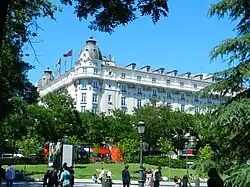 The chosen site was once an area occupied by barracks belonging to the Hippodrome Circus and the gardens of the old Theatre Tivoli, and was formerly owned by Jardines del Buen Retiro de Madrid.[5] The hotel's grand opening on 2 October 1910 was officiated by King Alfonso XIII in the company of ministers and representatives of the mayor of Madrid.[6] The hotel quickly became one of the leaders of the social and cultural life of the capital. The first board was chaired by Luis de Cuadra y Raúl Marquis de Guadalmina. The first hotel manager was Antonio Mella, who had previously managed the Ritz Hotel in Paris and London. His wife helped him in hotel management taking over guest services and laundry rooms.