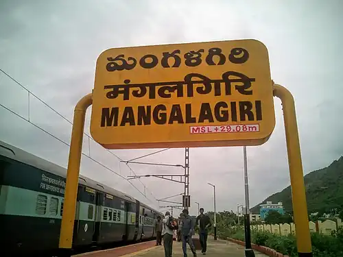 Mangalagiri railway station (station code: MAG[1]), is a D-category station in Guntur railway division of Indian Railways. It provides rail connectivity to Mangalagiri which is the part of Mangalagiri Tadepalli Municipal Corporation and is situated on Guntur–Krishna Canal section of South Central Railway zone.[2] It was awarded as tourist friendly station by Andhra Pradesh Tourism Development Corporation.[3]