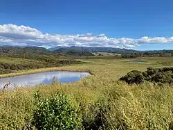 The freshwater wetland, south of the Whanganui Inlet,[2] is the largest remaining wetland in the Nelson-Marlborough region.[3][4] It covers an area of 350–400 hectares (860–990 acres).[3][5] It is bordered by hills in the south-east and north-west, the latter being limestone.[3][6] Streams from the hills drain into the wetland[6] and to the south it drains into the Patarau River and to the north into the Whanganui Inlet.[4] Soils are made up of peat.[6]