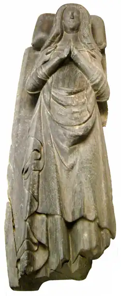 Detail from oak wood effigy believed to represent Lady Margaret II Audley,[1] formerly in Tawstock Church under a recessed arch in wall of north chancel, now in the Museum of Barnstaple and North Devon | |