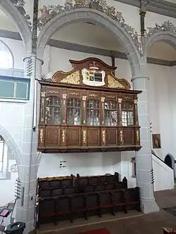 The self-contained Fürstenstuhl for the church's noble patrons, the Princes of Solms-Hohensolms-Lich, is located opposite of the pulpit. It was built in 1714 and re-located to its present site in 1859. It is a closed lodge with five windows between wooden pilasters and arches and bears a label reading "1714" and a coat of arms from 1859. The church pews in the nave date to 1705. Below the Fürstenstuhl are the remaining early Renaissance choir pews, which were made in 1530 and were originally arrayed on both sides of the choir between the columns.[18] Behind the door of the doorway to the south gallery is a wooden board which served as a Henkerssitz, the special seat for the town executioner. This was meant to enable him to participate in the service although he was unclean.[31]