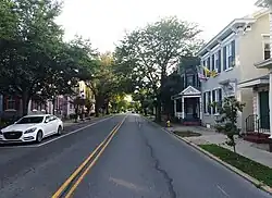 Market Street is a downtown street in Lewisburg, Pennsylvania, United States. It runs for around 1.6 miles (2.6 km), from Main Street, at the Union County/Northumberland County line, in the east to North Fairground Road in the west. It is part of Pennsylvania Route 45. West of its intersection with Derr Drive (U.S. Route 15), it is named West Market Street. From the West Branch Susquehanna River inland, Market Street's cross streets are numbered 2 through 8, with Front Street replacing what was originally 1st Street. These cross streets are named "North" or "South" depending on their location relative to Market Street. Lewisburg's street layout was designed by Ludwig Derr in 1785, and is believed to have been inspired by that of Philadelphia.[1]