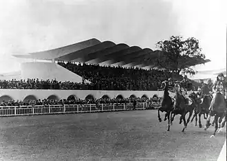 The old Hipódromo de la Castellana (1877–1888), on the site of Nuevos Ministerios, wa265px|s demolished as required by the development of Madrid to the North according to the Plan de Zuazo-Jannsen (opening of the prolongation of the Castellana). The Access and Special Technical Office of Madrid announced a tender to build another one in the term of the Zarzuela (Quinta de el Pardo). The project of Carlos Arniches, Martín Domínguez and the engineer Eduardo Torroja was built between 1934 and 1936. The roof reached 12.8 meters of the span with only 5 centimeters of thickness at its ends, it rests on pillars 5 meters apart.[5]