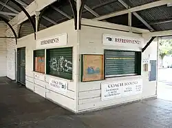 The original refreshment rooms building is a timber-framed building clad with chamferboards. The gabled roof is clad in corrugated iron. The building is connected to the main station building by the platform and platform awnings. Internally the building consists of a kitchen and dining room area.[1]