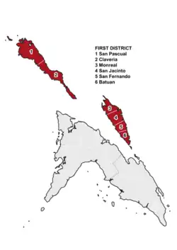 Masbate's 1st congressional district is one of the three congressional districts of the Philippines in the province of Masbate. It has been represented in the House of Representatives since 1987.[3] The district consists of six municipalities in the Burias and Ticao islands of northern Masbate, namely: Claveria and San Pascual in Burias island and Batuan, Monreal, San Fernando and San Jacinto in Ticao island.[4] It is currently represented in the 19th Congress by Richard Kho of the Lakas–CMD.[5]