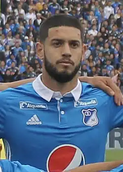 On 30 June 2017, de los Santos agreed a loan to Millonarios of Colombia's Categoría Primera A.[5][6] Two goals came as they won the 2017 Clausura.[1] June 2018 saw Millonarios sign de los Santos permanently.[1] He would move clubs again one year later, though did manage to take his overall tally to eighty-three matches and six goals in the preceding months - winning the 2018 Superliga Colombiana in the process.[1] On 18 July 2019, de los Santos secured a one-year loan move to Argentina with Vélez Sarsfield; with a future purchase option.[7][8][9] He made seven total appearances, before returning to Millonarios in June 2020.[1]