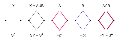 If X is the suspension SY of a space Y, let A and B be the complements in X of the top and bottom 'vertices' of the double cone, respectively. Then X is the union A∪B, with A and B contractible. Also, the intersection A∩B is homotopy equivalent to Y. Hence the Mayer–Vietoris sequence yields, for all n,[18]