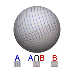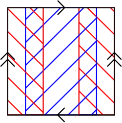 A slightly more difficult application of the Mayer–Vietoris sequence is the calculation of the homology groups of the Klein bottle X. One uses the decomposition of X as the union of two Möbius strips A and B glued along their boundary circle (see illustration on the right). Then A, B and their intersection A∩B are homotopy equivalent to circles, so the nontrivial part of the sequence yields[16]